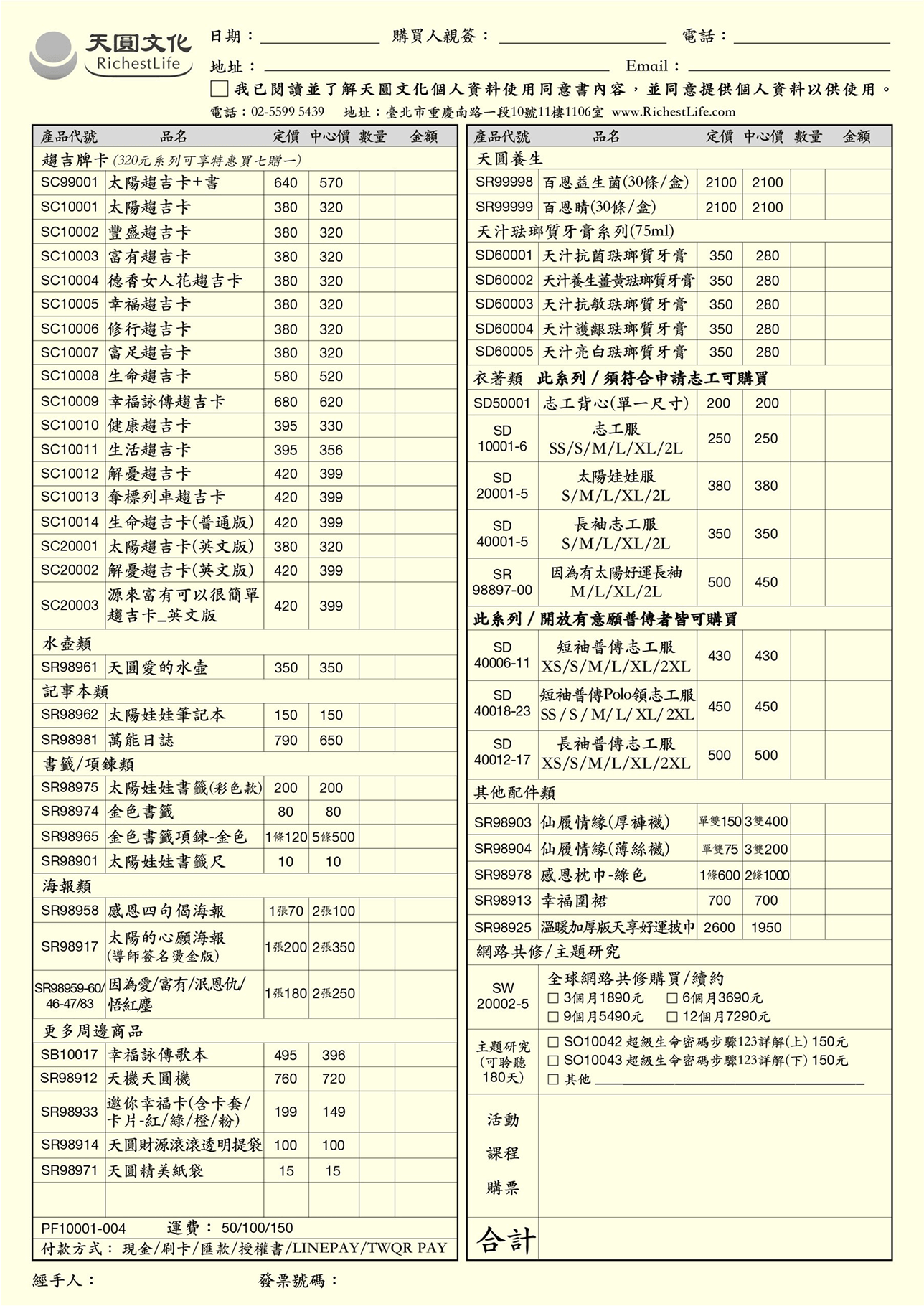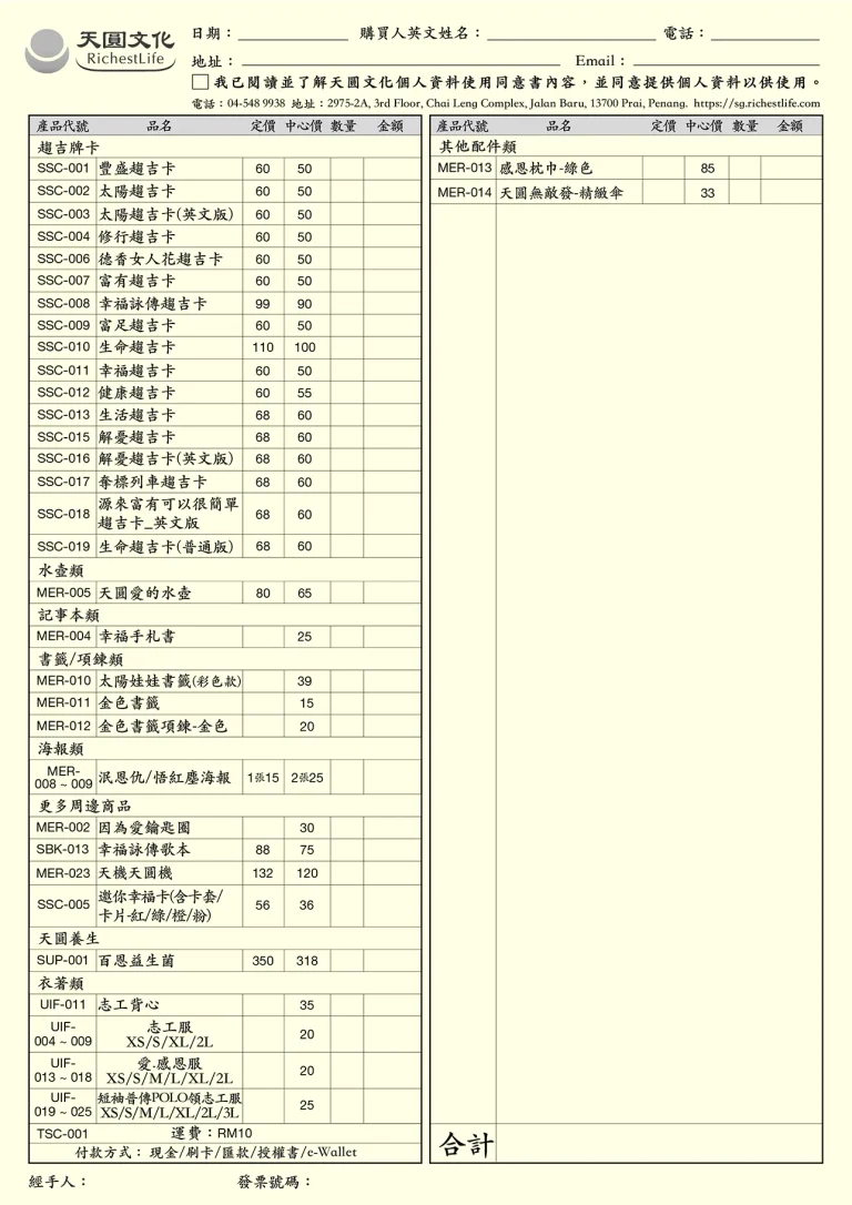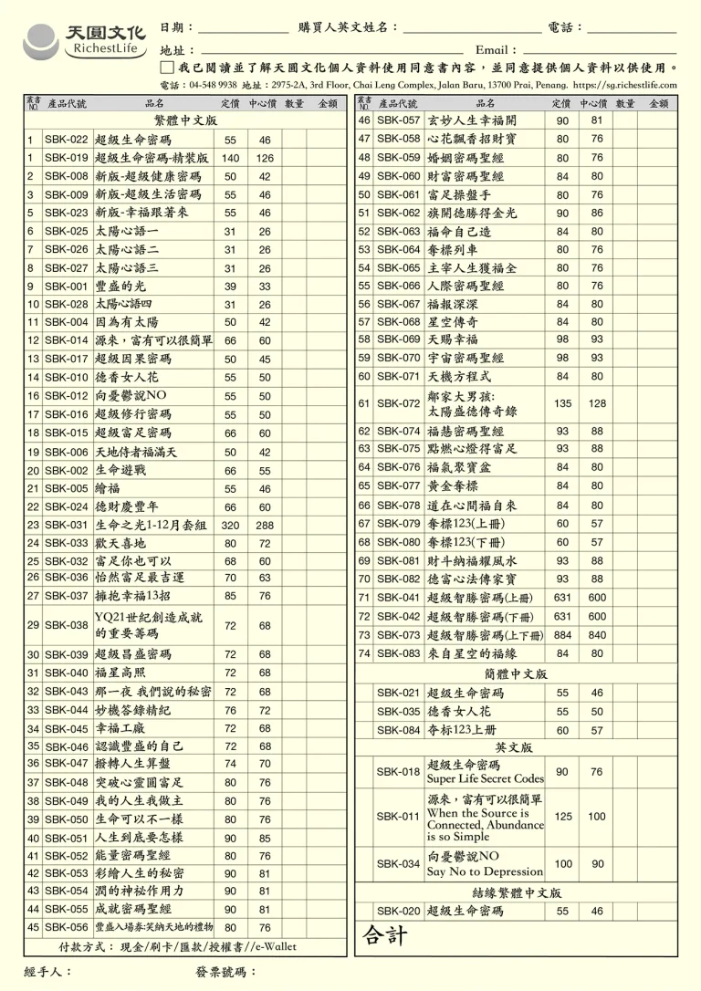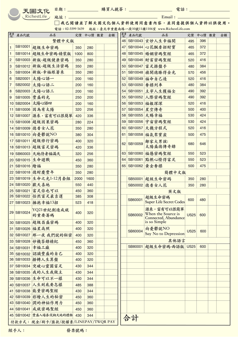 訂購單查詢/下載 提供實體中心書籍/商品現場訂購單 書籍訂購單(台灣) 點圖可放大查看及下載 商品訂購單(台灣) 點圖可放大查看及下載 書籍訂購單(馬來西亞) 點圖可放大查看及下載 商品訂購單(馬來西亞) 點圖可放大查看及下載 首頁 訂購單查詢/下載