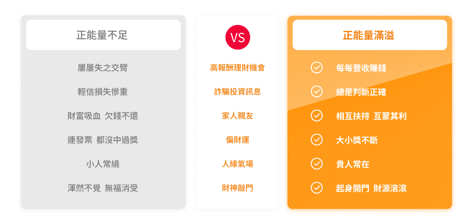 我們的宇宙能量心法是世間難得的大法,能幫助你「有效」消除負能量並瞬間接通宇宙源源不絕的正能量;當正能量>負能量,就能啟動正能量吸引力法則,你的「際遇」會開始改變,宇宙天地會用適合你的方式,讓你的金錢財富逐漸累積,甚至翻倍!